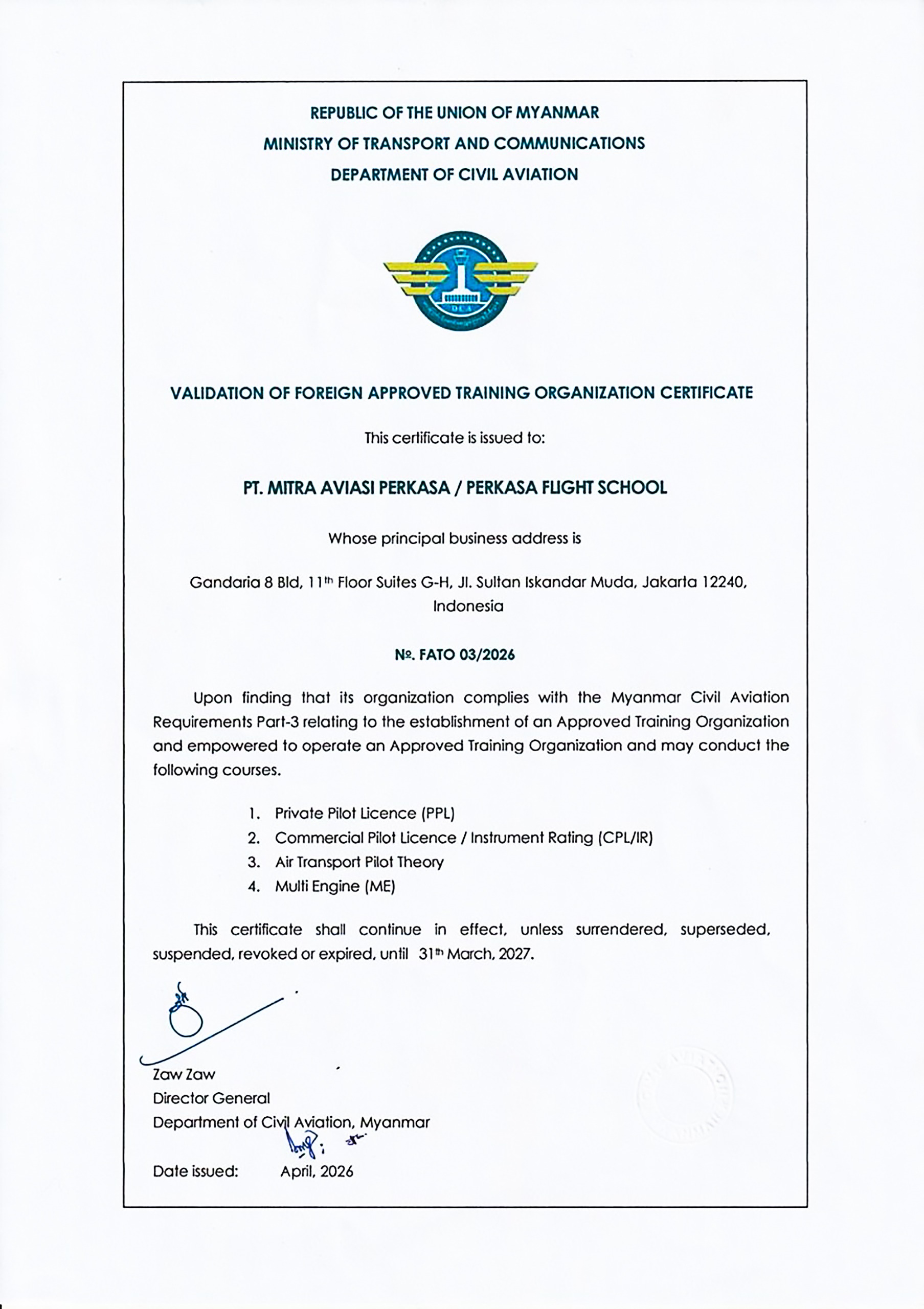 Issued under the Ministry of Transport and Communications of the Republic of the Union of Myanmar, this approval confirms that Perkasa Flight School meets the regulatory standards required to provide pilot training for Myanmar nationals. The certification is valid until 31 March 2027.